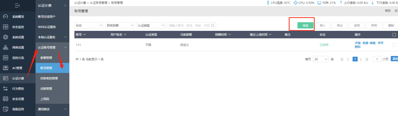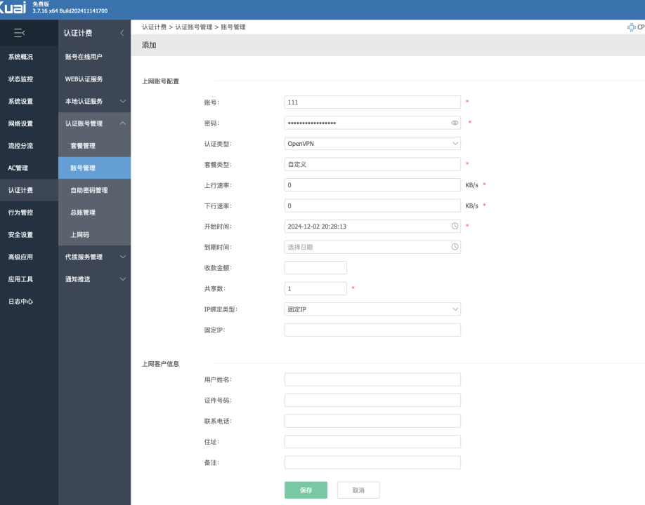 在认证计费--认证账号管理--账号管理,里面添加VPN账号密码