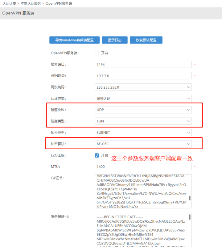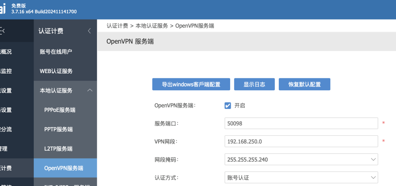依次打开 认证计费> 本地认证服务> OpenVPN服务端